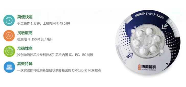 本產(chǎn)品采用博奧自主研發(fā)的微流控集成式核酸提取純化和高靈敏度擴增檢測技術(shù),由國家科技部“新型冠狀病毒感染的肺炎疫情應(yīng)急項目”支持,能快速精準(zhǔn)地完成對新型冠狀病毒的“樣本進—結(jié)果出”式全自動、全密閉檢測。特殊工藝制作的微流控芯片上集成了樣本裂解、核酸提取、巢式擴增和熒光檢測等功能,通過芯片巢式恒溫擴增技術(shù),實現(xiàn)對痕量病毒核酸高敏擴增和檢測,每張芯片可檢測兩個樣本,能在45分鐘內(nèi)一步完成全程實驗,達到對新型冠狀病毒核酸的快速檢測。(國械注準(zhǔn):20213400101)