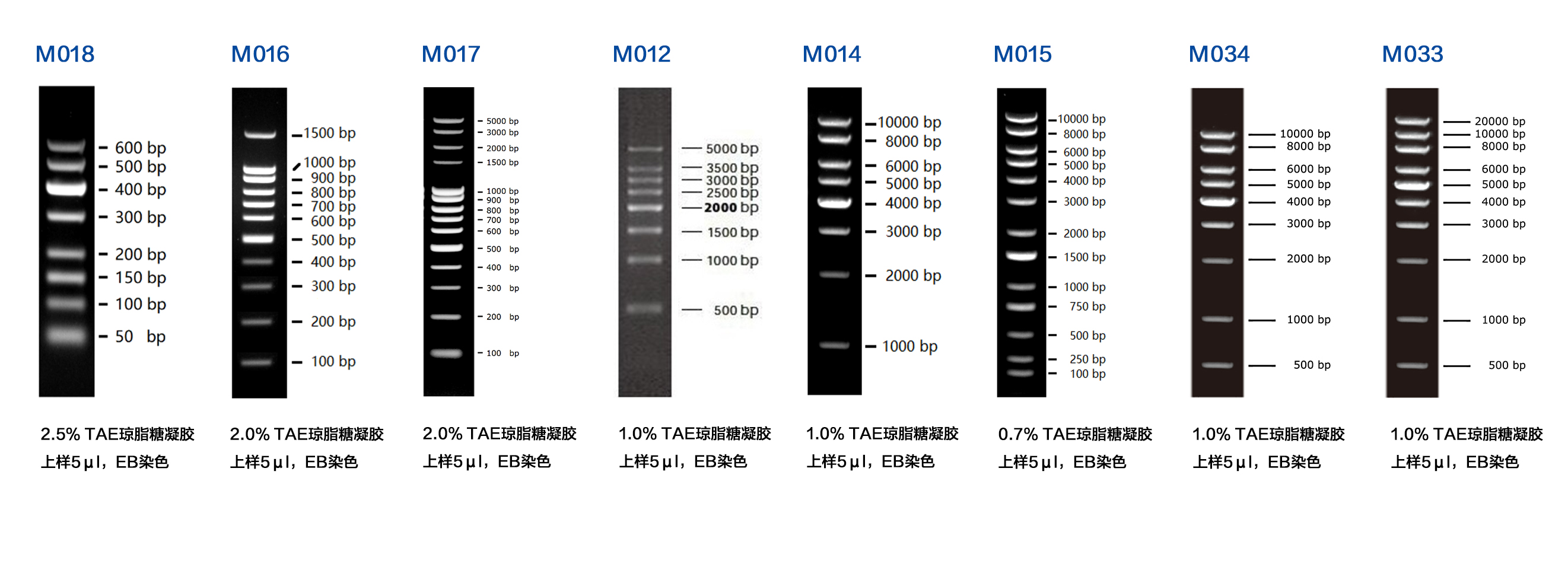本產品為預混有 1x 上樣緩沖液的即用型 DNA 分子量標準,由 8 條線狀雙鏈 DNA 條帶組成,適用于對 1000-10000 bp 的雙鏈 DNA 分子大小的估算和粗略定量。本產品的 8 條帶分別為 1000、2000、3000、4000、5000、6000、8000 和 10000 bp。其中 4000 bp 條帶濃度最大,為 20 ng/µl,其余條帶濃度約為 10 ng/µl。
