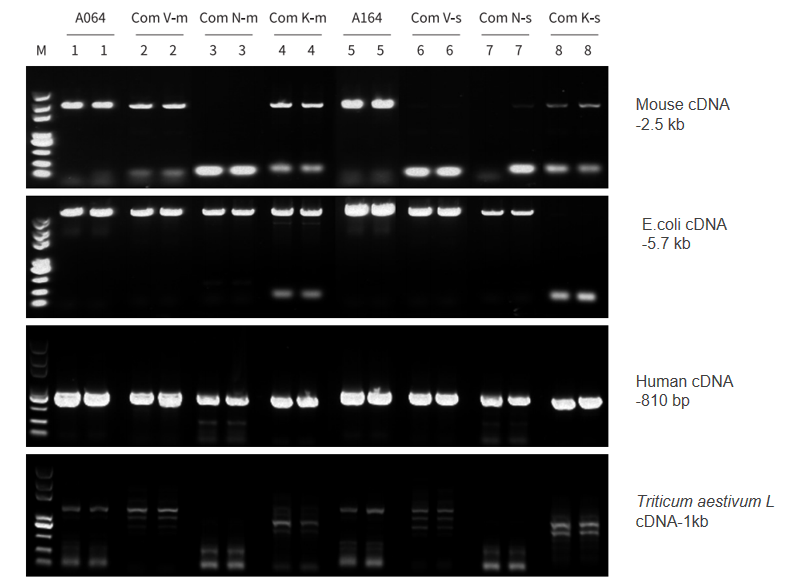 分別以人、小鼠、E.coli cDNA 為模板,使用 A064/A164、Com V、Com N、Com K 進(jìn)行不同長(zhǎng)度片段擴(kuò)增。結(jié)果顯示,A064/A164 對(duì)不同種屬來(lái)源不同長(zhǎng)度的 cDNA 片段兼容性強(qiáng),均能良好擴(kuò)增