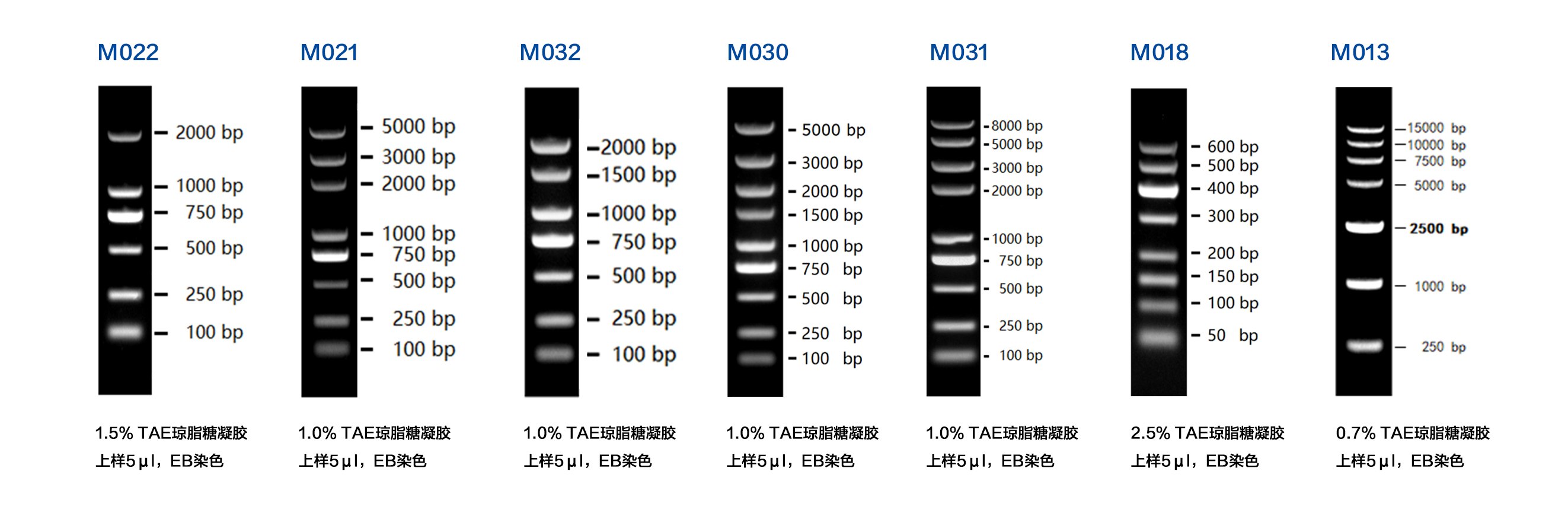 本產品為預混有 1× 上樣緩沖液的即用型 DNA 分子量標準,由 9 條線狀雙鏈 DNA 條帶組成,適用于對 100-8000 bp 的雙鏈 DNA 分子大小的估算和粗略定量。本產品的 9 條帶分別為 100、250、500、750、1000、2000、3000 和 5000 bp、8000 bp。其中 750 bp 條帶濃度最大,為 100 ng/5 µl,其余條帶濃度約為 50 ng/5 µl。