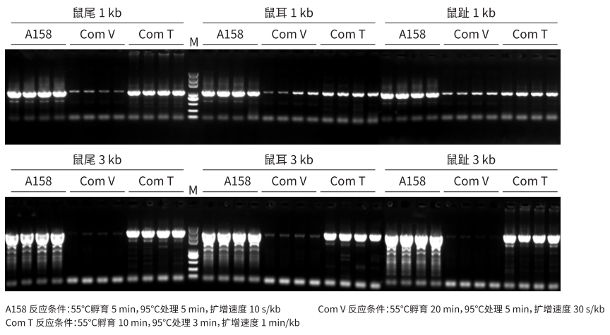 以鼠尾、鼠耳、鼠趾裂解液為模板,分別使用 A158、Com V、Com T 進(jìn)行擴(kuò)增。結(jié)果顯示,A158 較 Com V、Com T 裂解速度和擴(kuò)增速度更快,擴(kuò)增效率更高