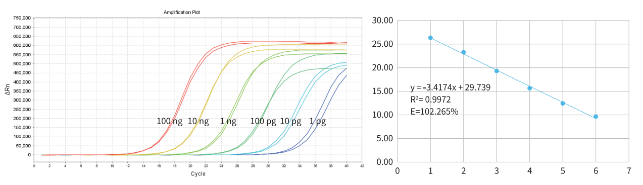 以 100 ng、10 ng、1ng、100pg、10pg、1pg 的小鼠 RNA 為模板,使用 A388 進(jìn)行檢測(cè)。結(jié)果顯示,A388 的檢測(cè)下限可達(dá) 1 pg,且擴(kuò)增效率高