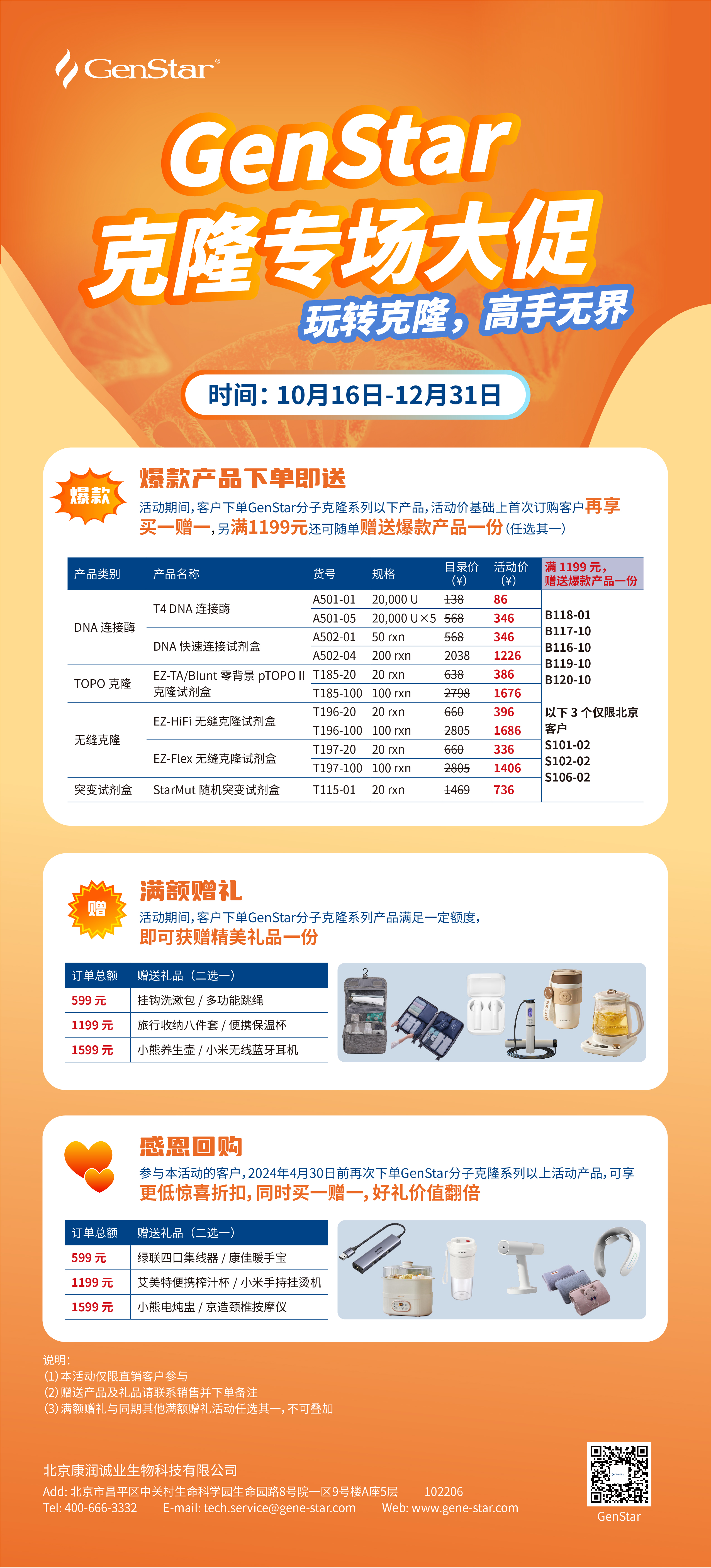 分子克隆是分子生物學的一項核心技術(shù),發(fā)展至今,從經(jīng)典的酶切酶連法、快捷簡單的TOPO克隆法到靈活高效的同源重組克隆,都有其各自的優(yōu)勢和應用場景。GenStar的分子克隆系列產(chǎn)品經(jīng)過不斷優(yōu)化和迭代,自上市以來,備受眾多客戶的認可和支持。為回饋新老客戶,我們特推出分子克隆系列產(chǎn)品專場促銷,助您的分子克隆實驗脫離“靠運氣”的魔咒,從入門到精通。