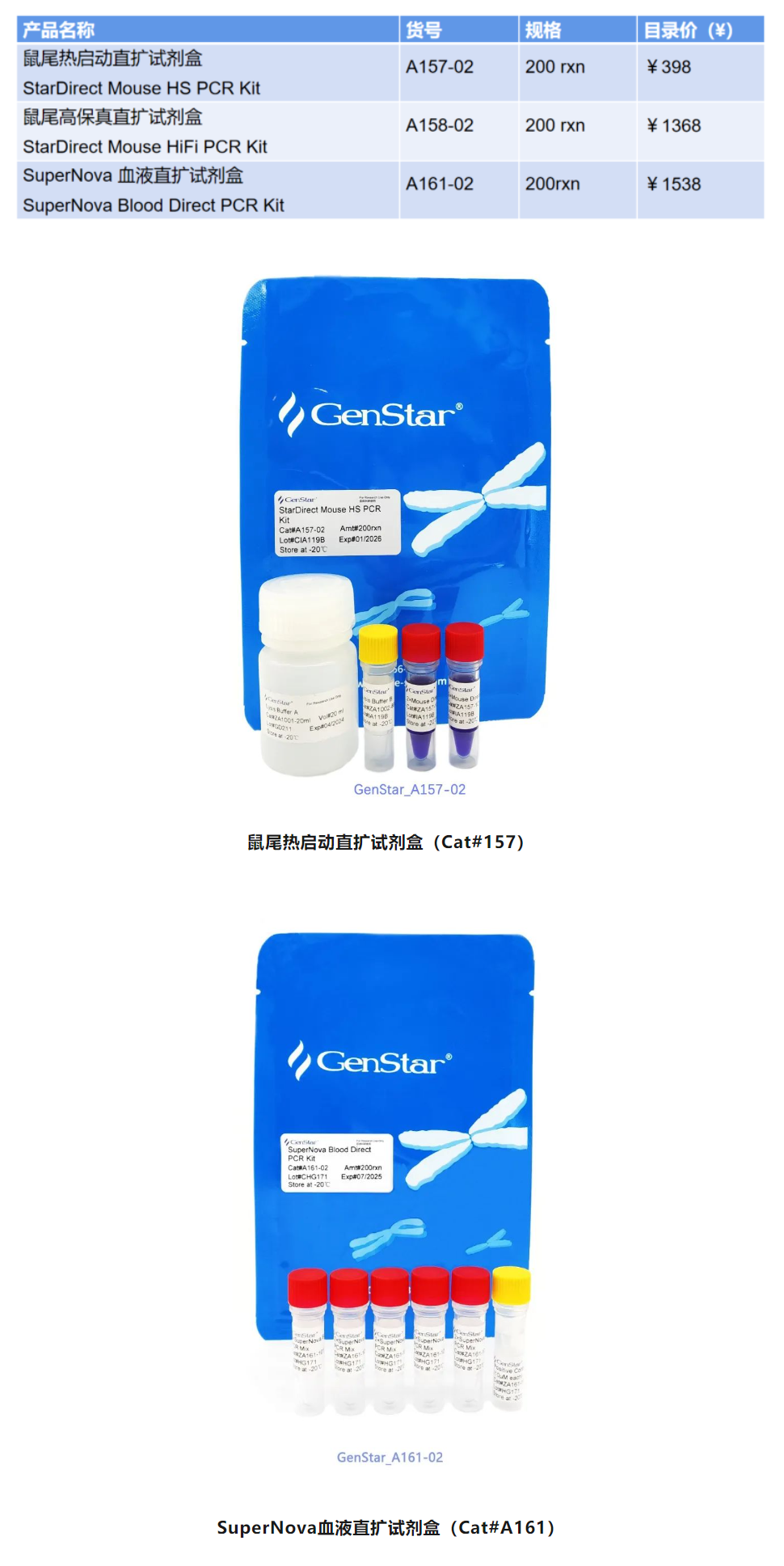 GenStar直擴PCR系列為本次展會咨詢的明星產(chǎn)品,GenStar直擴PCR系列產(chǎn)品包括鼠尾直擴試劑盒和血液直擴試劑盒。無需核酸提取,直接使用動物或植物組織等即可進行PCR反應(yīng)。省去了核酸提取環(huán)節(jié),不僅能節(jié)省時間,又能節(jié)省成本,為核酸擴增和檢測帶來前所未有的便捷。