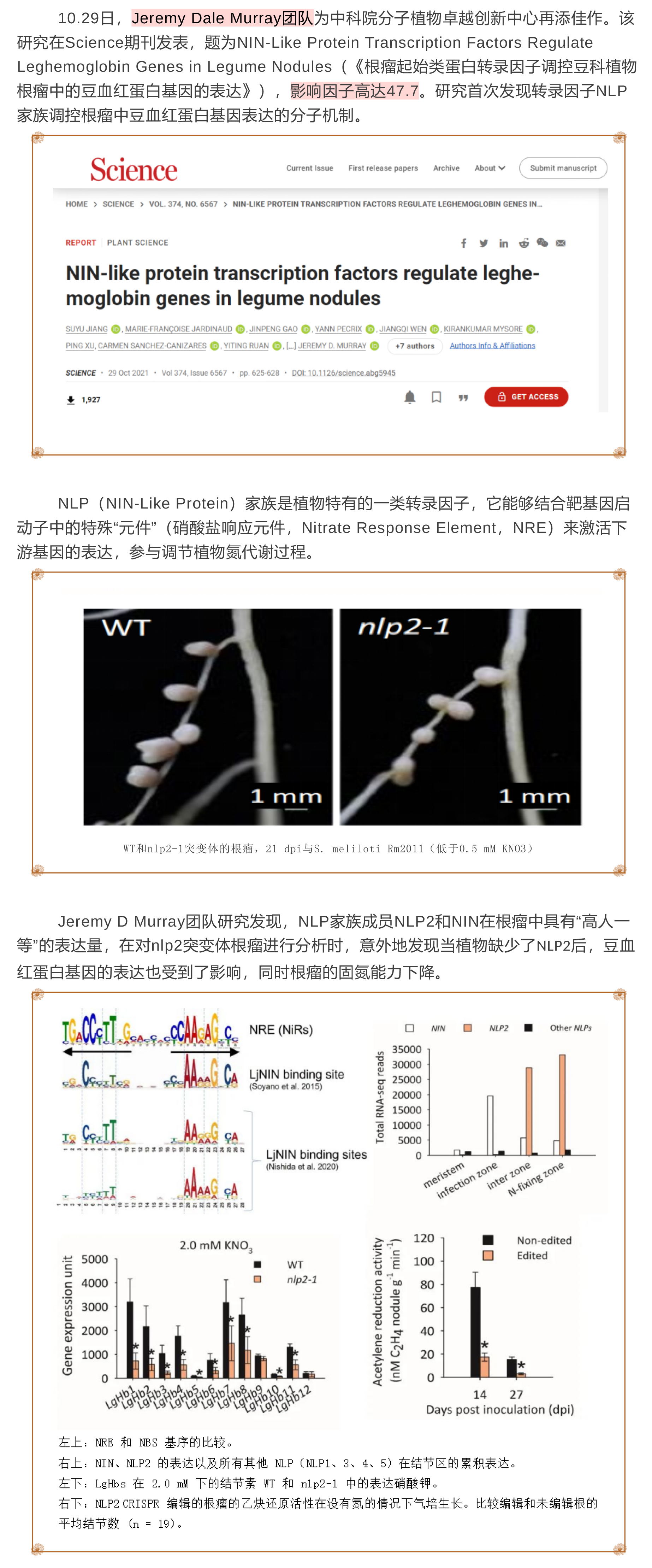 該團(tuán)隊(duì)進(jìn)一步研究發(fā)現(xiàn)NLP家族成員NIN和NLP2通過(guò)直接結(jié)合豆科植物保守的雙重硝酸鹽響應(yīng)元件(dNRE)來(lái)激活根瘤中豆血紅蛋白基因的表達(dá),平衡固氮所必需的氧氣微環(huán)境。系統(tǒng)發(fā)育分析表明,dNRE和NLP2僅在豆科植物中高度保守,暗示著其進(jìn)化有助于提高根瘤中豆血紅蛋白的表達(dá)水平。而非共生血紅蛋白的攜氧特性有助于植物在低氧環(huán)境中生存。